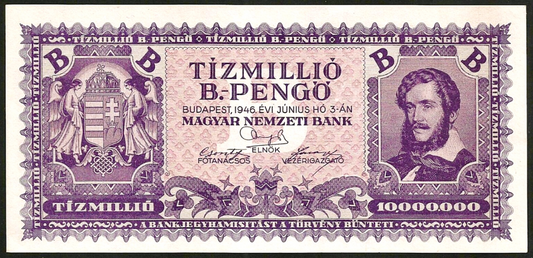 Hungary 10 Millió B-Pengő 1946 P-135 (10,000,000,000,000,000,000 Pengos)