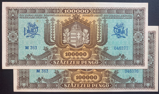 Hungary 100 000 Pengő 1945 P-121a AUNC+ CONSECUTIVE