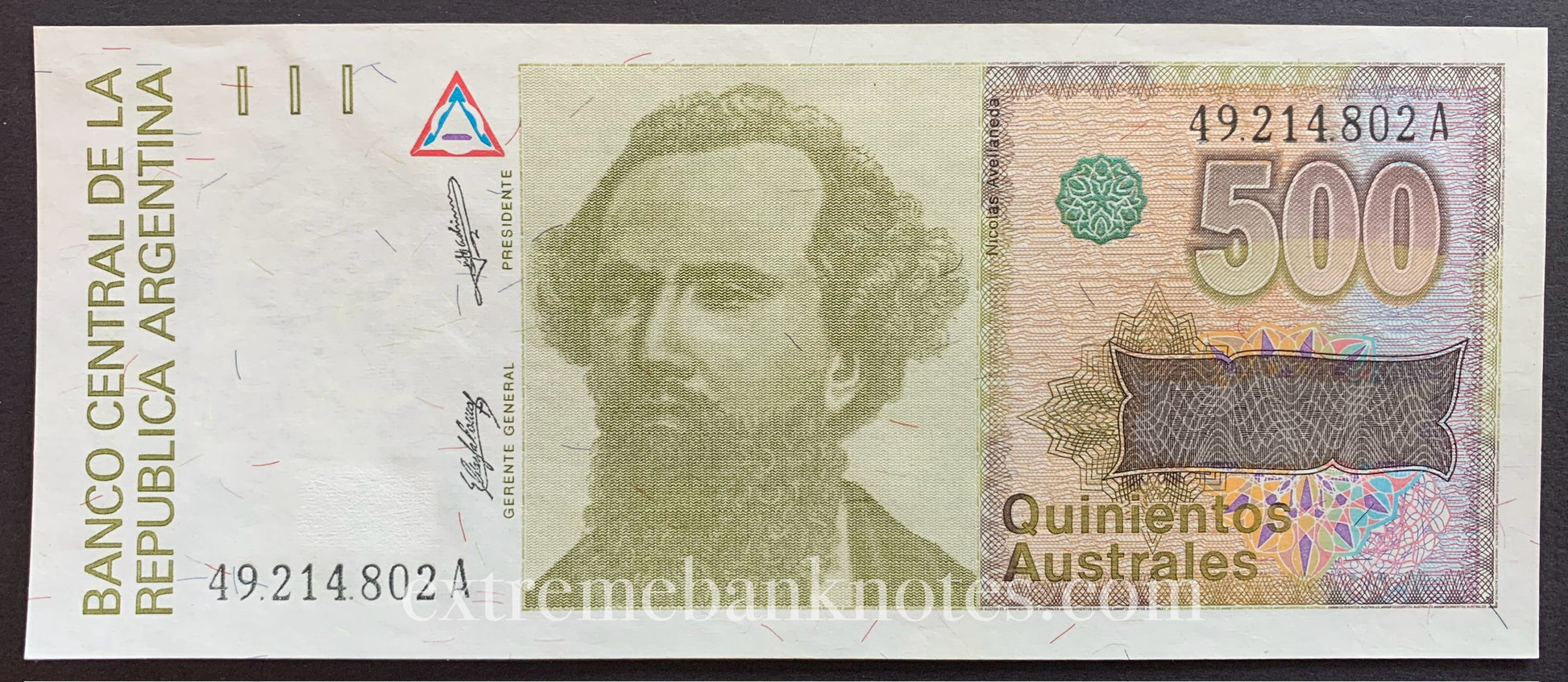- Argentina 500 Austral ND (1988) P-328a (Series A, Signatures: ES, JLM)