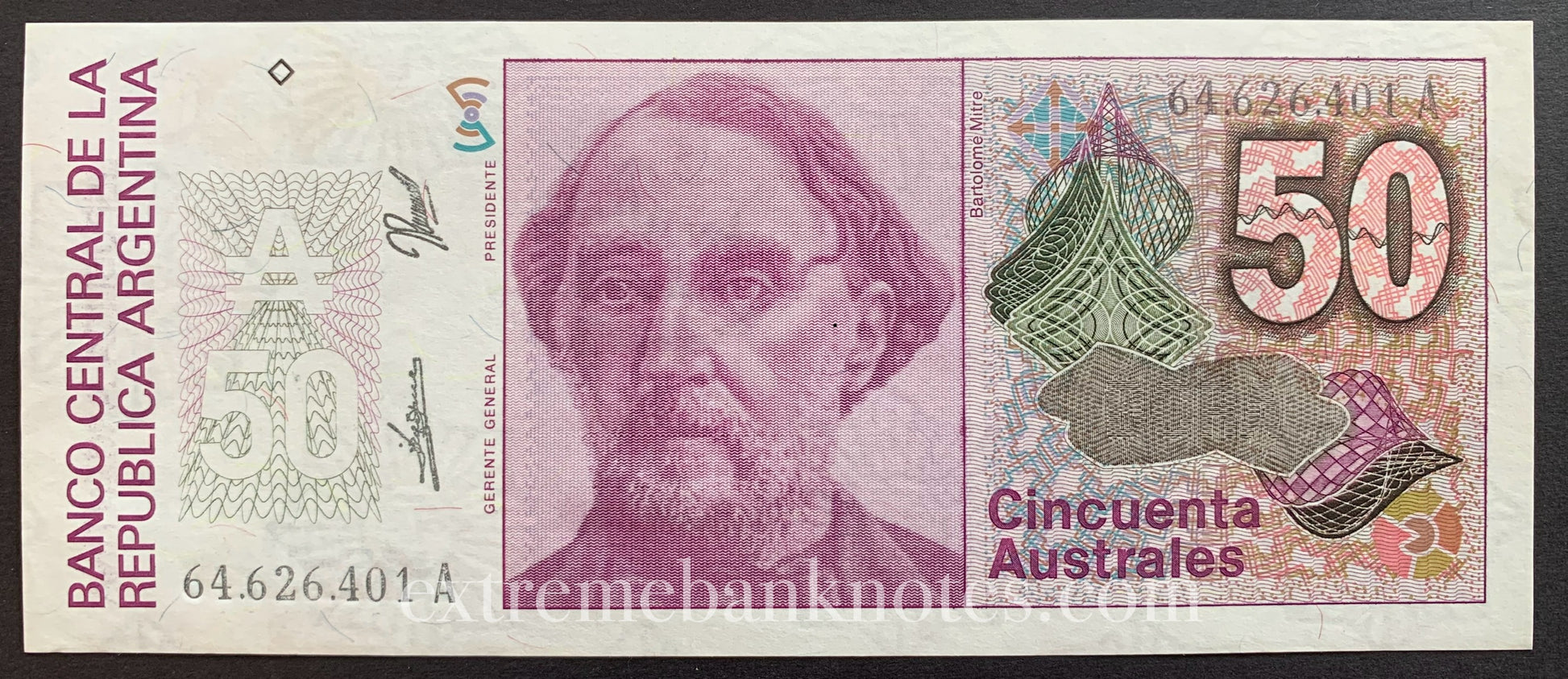 - Argentina 50 Austral ND (1989) P-326a (Series A, Signatures: REDP, JGF)