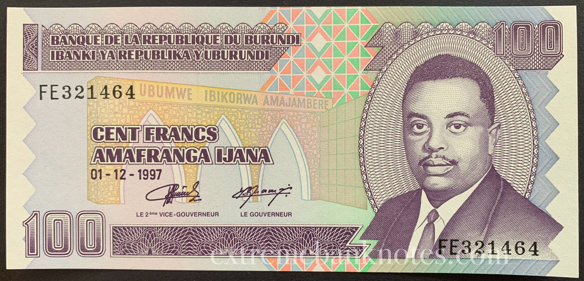 Burundi one hundred Franc banknote from 1997 Pick no. 37b in Uncirculated condition. Graded according to the Standard Catalog of World Paper Money.