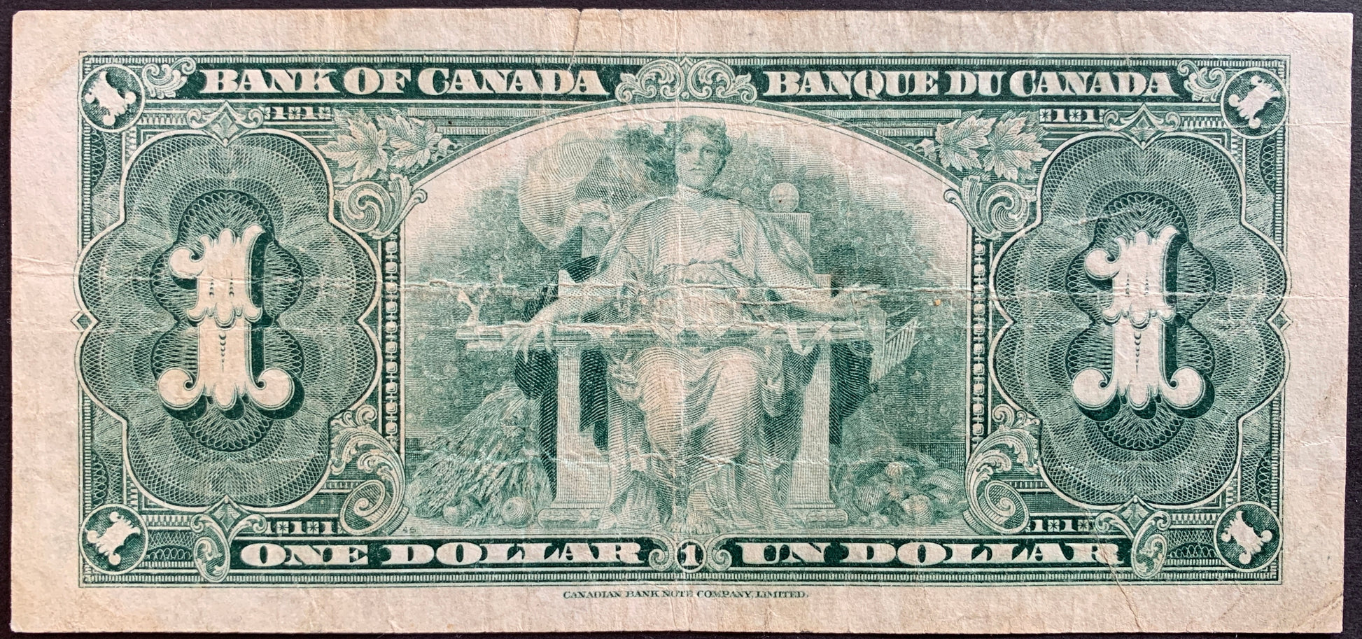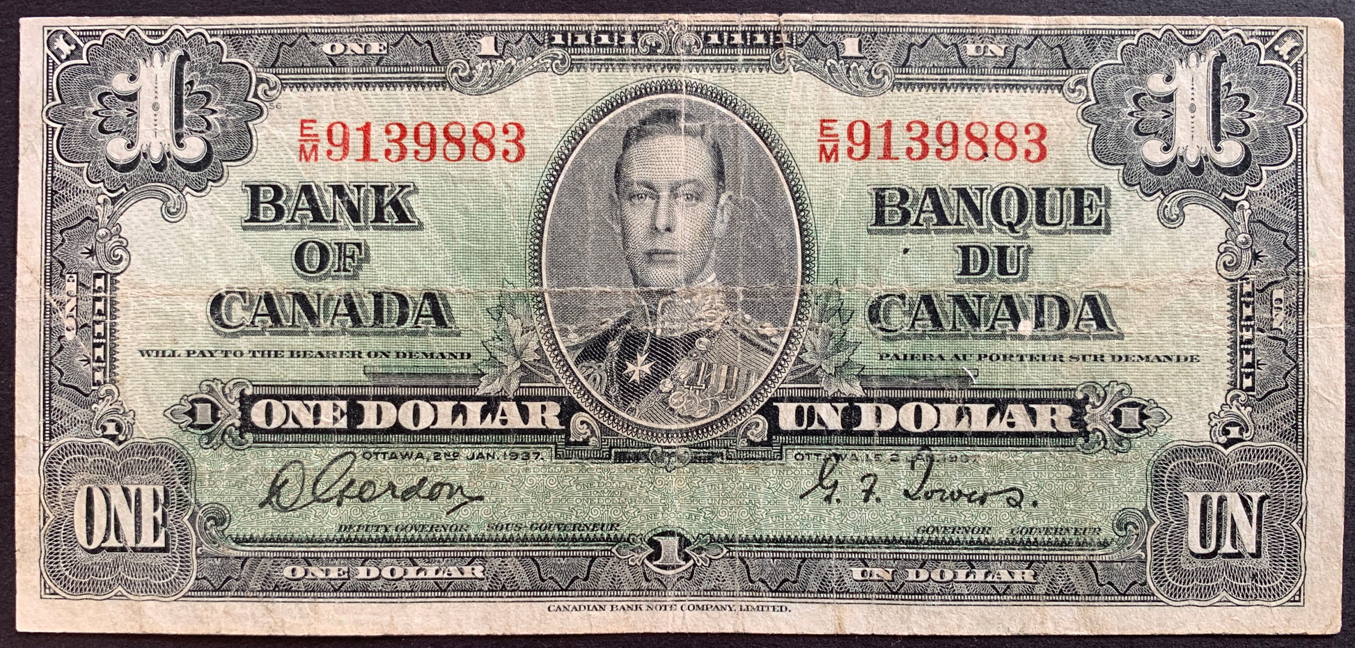 Canada one Dollar banknote from 1937 Pick no. 58d in Very Fine condition. Graded according to the Standard Catalog of World Paper Money.