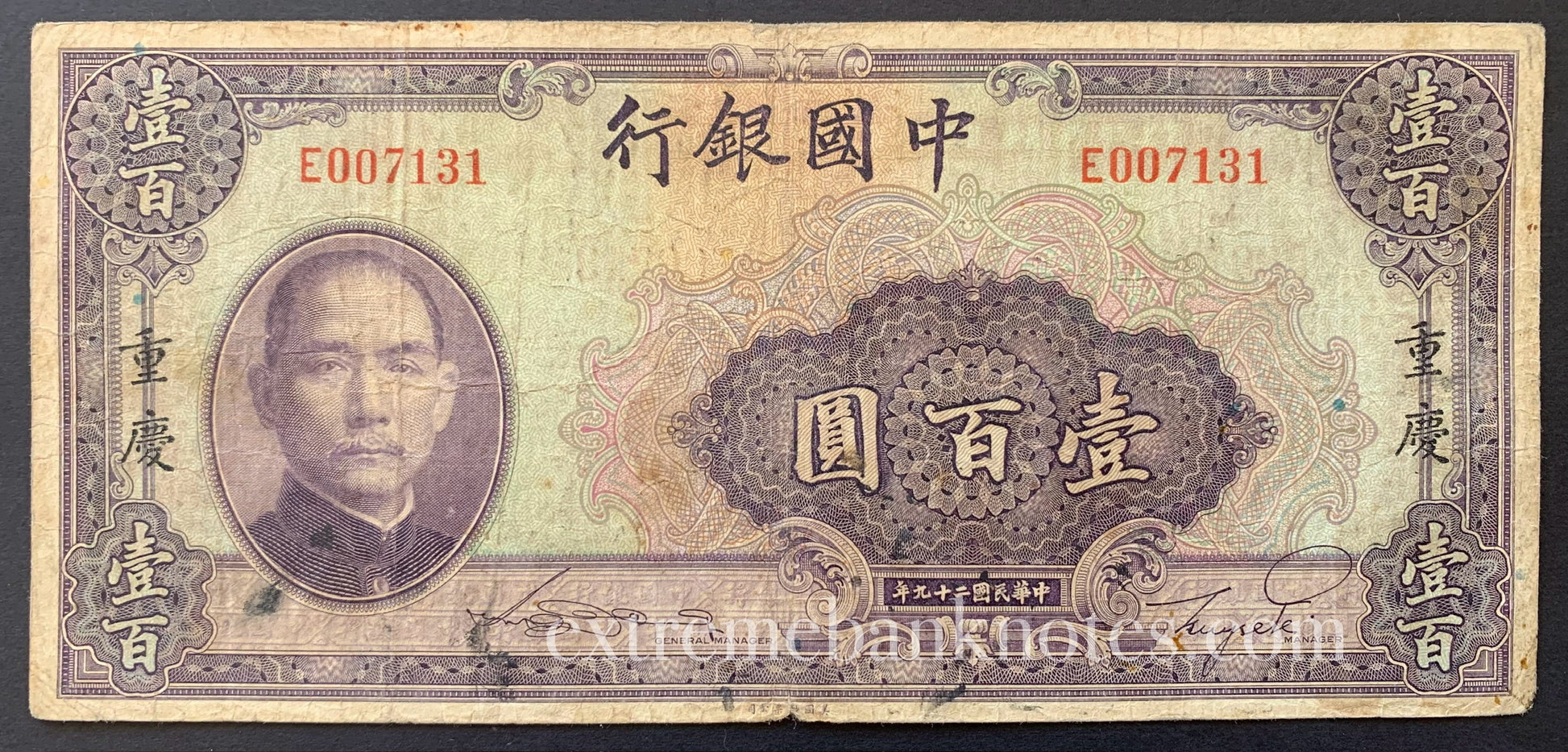 China 100 Yuan CHUNGKING 1940 P-88c VG