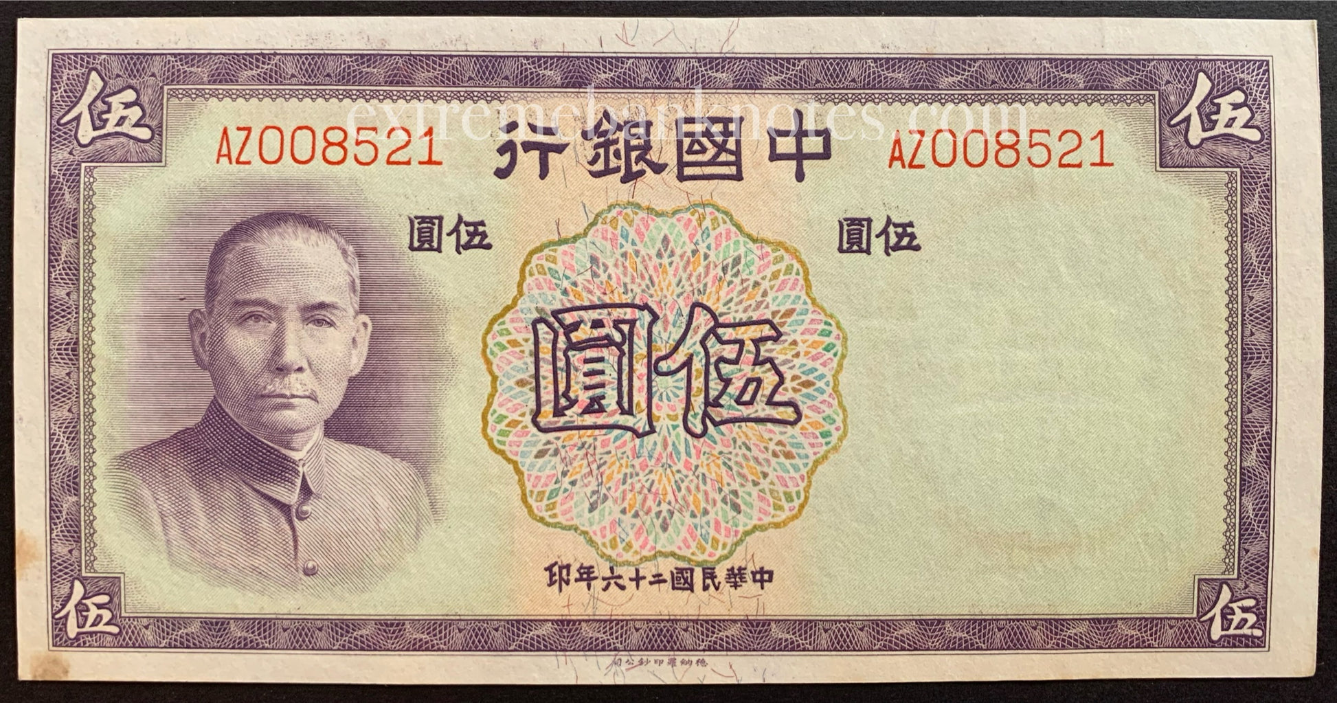 China five Yuan banknote from 1937 Pick no. 80 in About Uncirculated condition. Graded according to the Standard Catalog of World Paper Money.