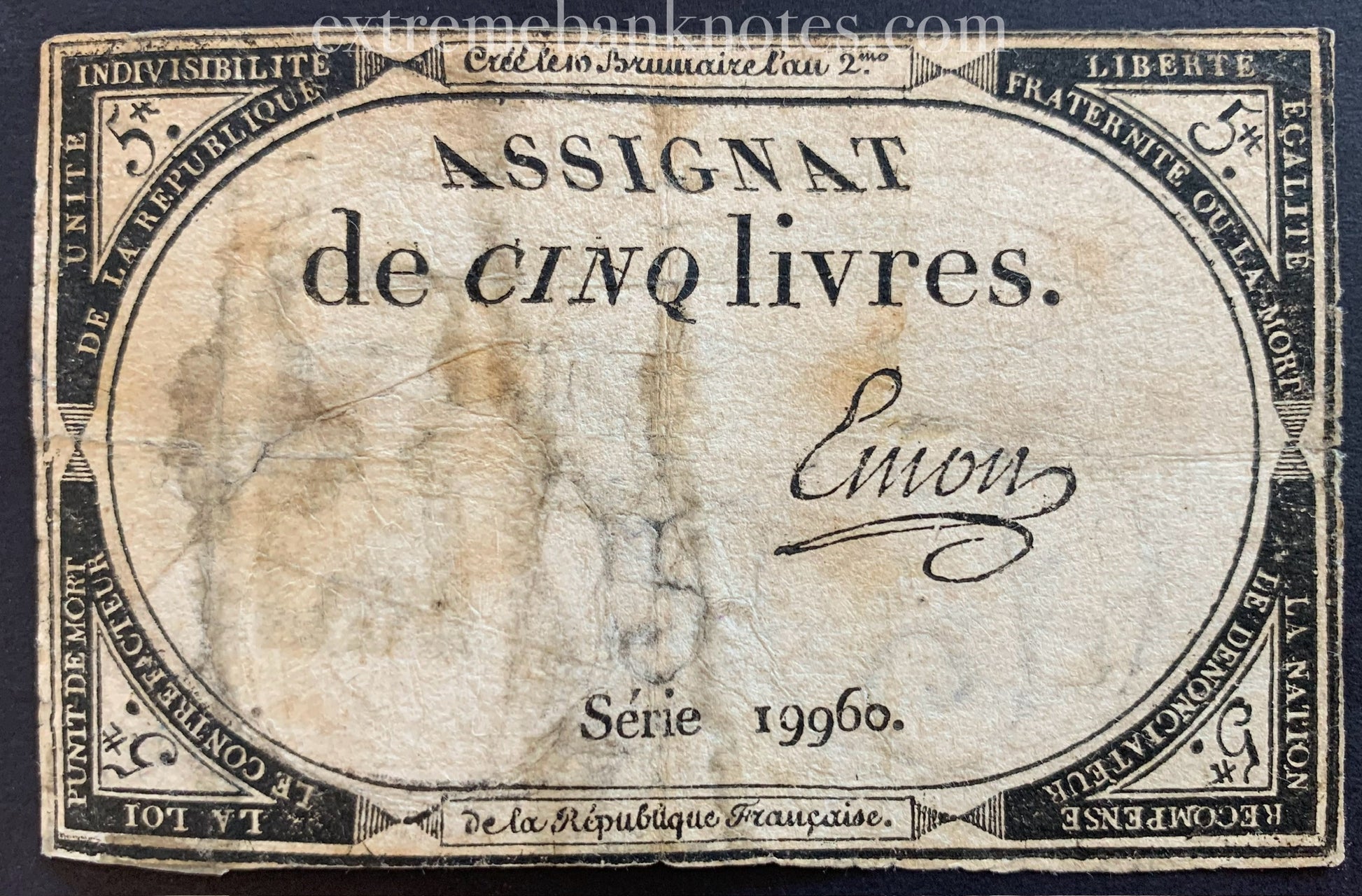 France five Livres Assignat banknote from 1793 Pick no. A76 in Good condition. Graded according to the Standard Catalog of World Paper Money.