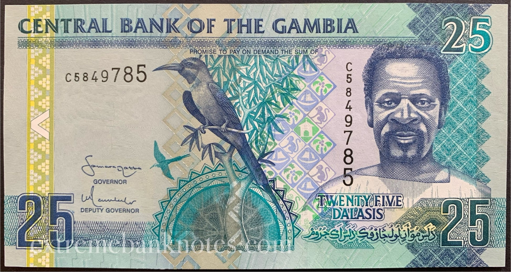 The Gambia twenty five Dalasis banknote from 2006 Pick no. 27a in Uncirculated condition. Graded according to the Standard Catalog of World Paper Money.