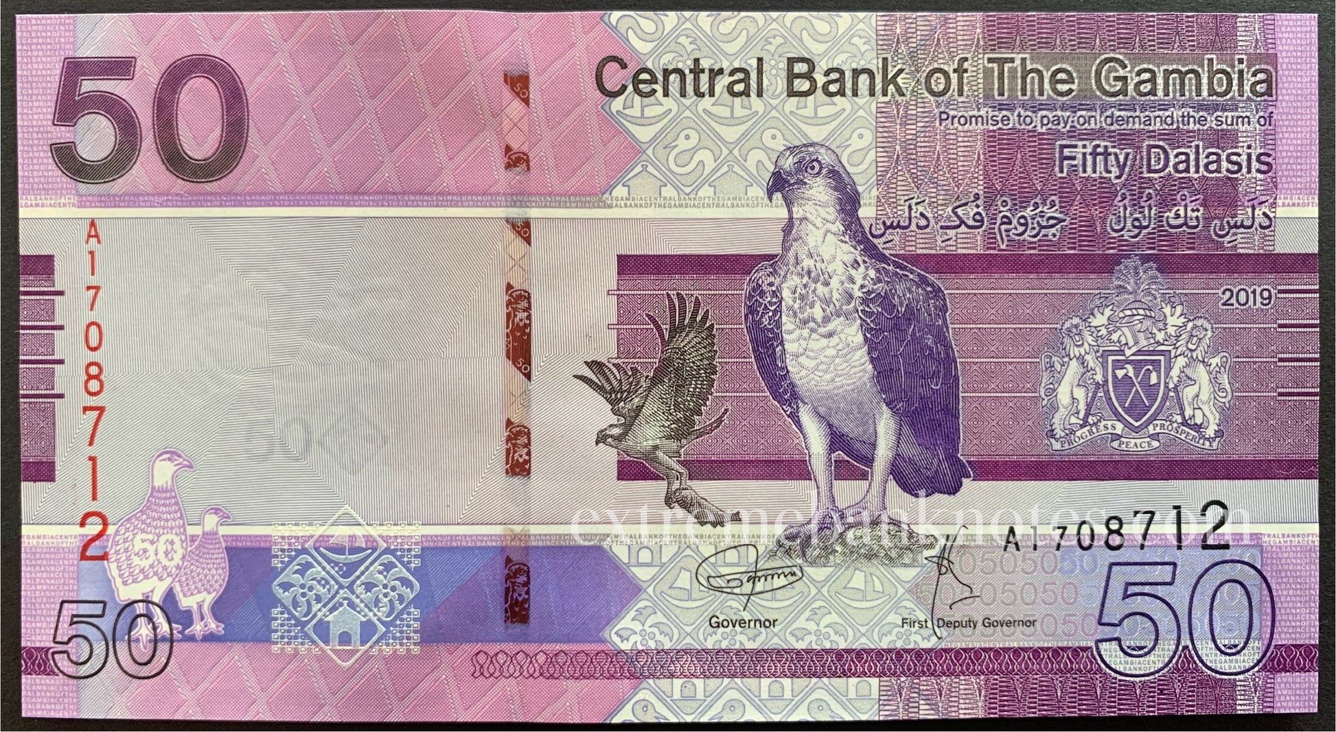 The Gambia fifty Dalasis banknote from 2019 The Banknote Book no. 238a in Uncirculated condition. Graded according to the Standard Catalog of World Paper Money.