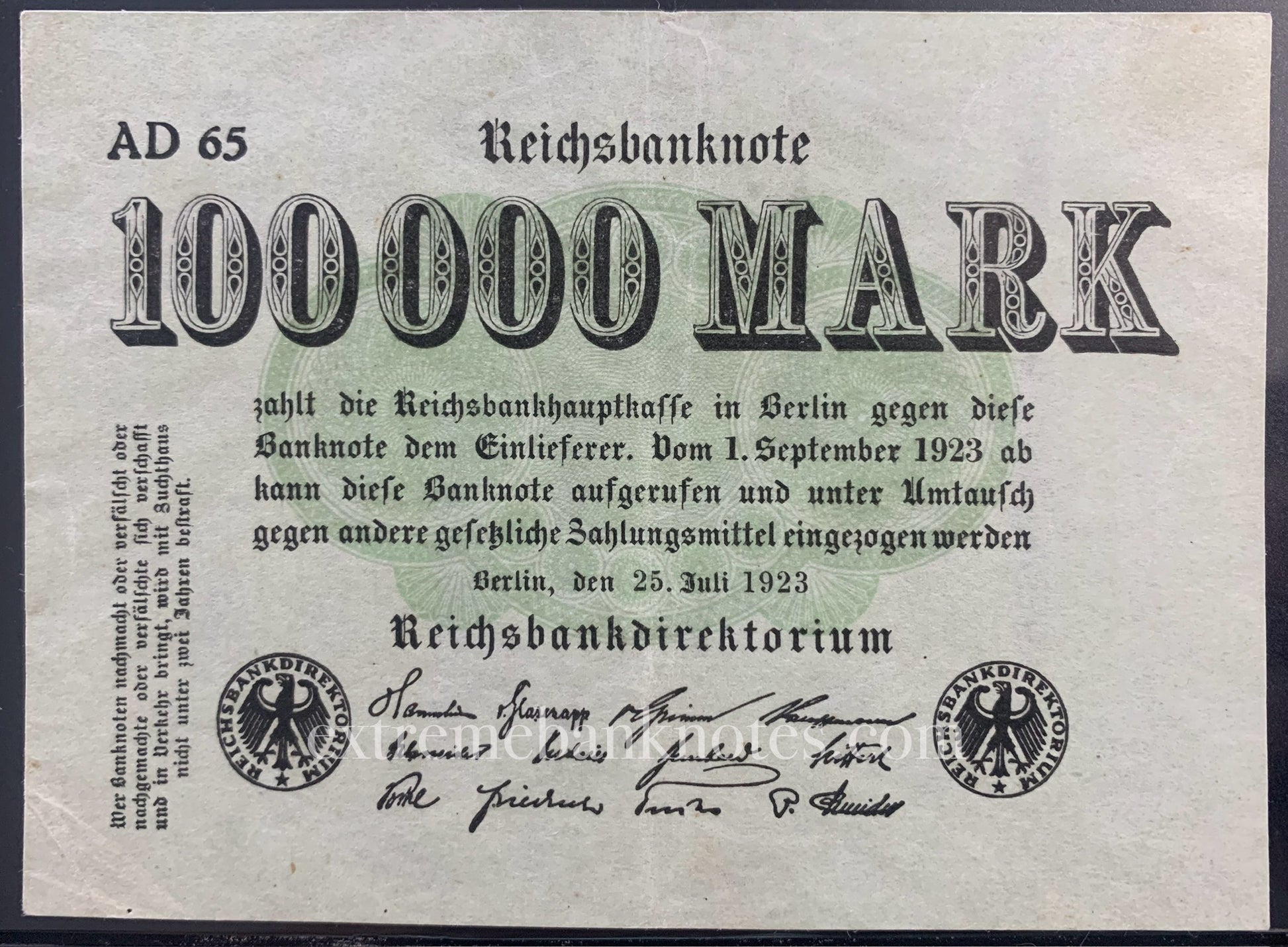Germany one hundred thousand Mark banknote from 1923 Pick no. 91b in Very Fine condition. Graded according to the Standard Catalog of World Paper Money.