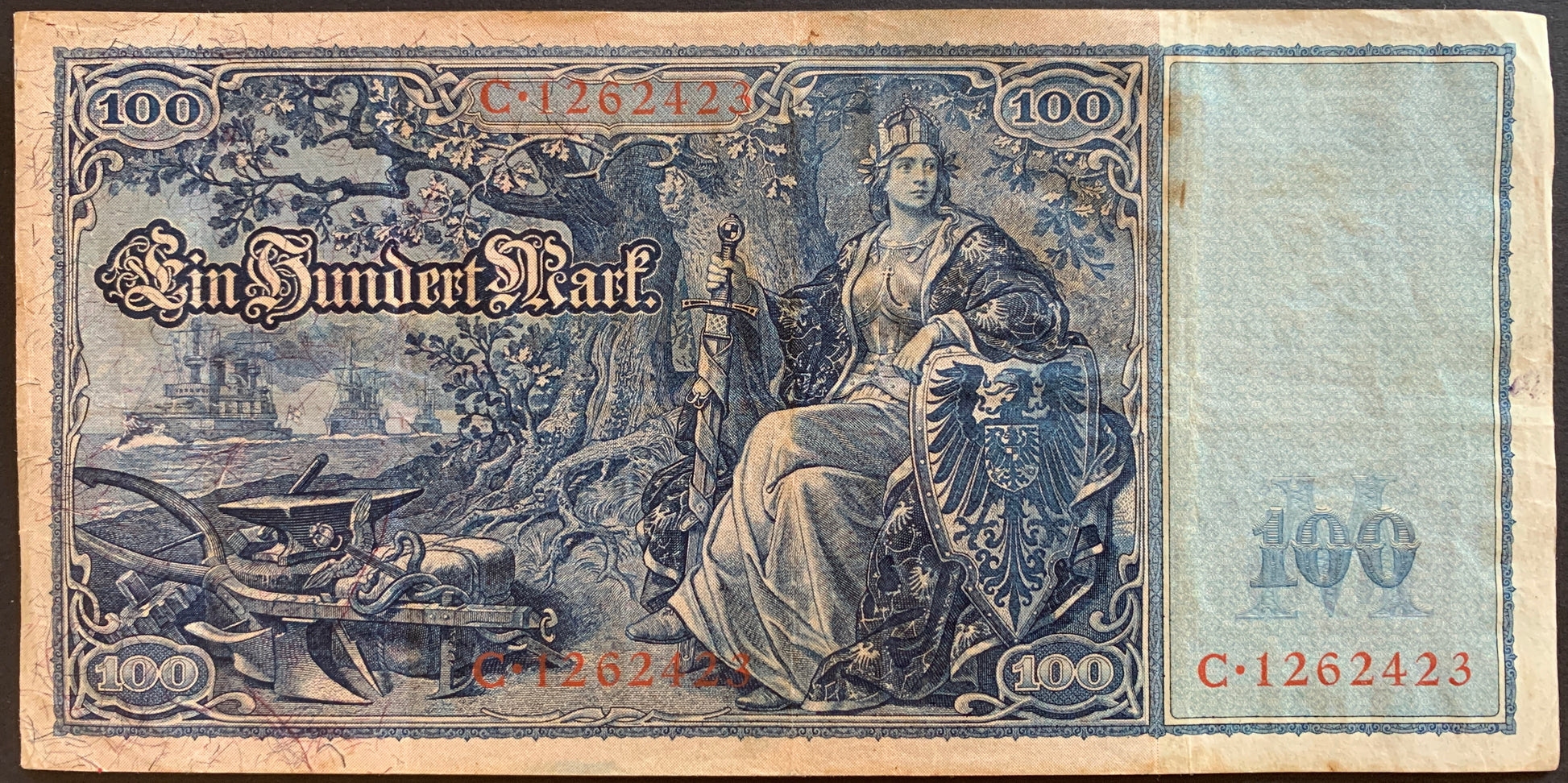 Germany one hundred Reichsmark banknote from 1908 Pick no. 35 in Very Fine condition. Graded according to the Standard Catalog of World Paper Money.