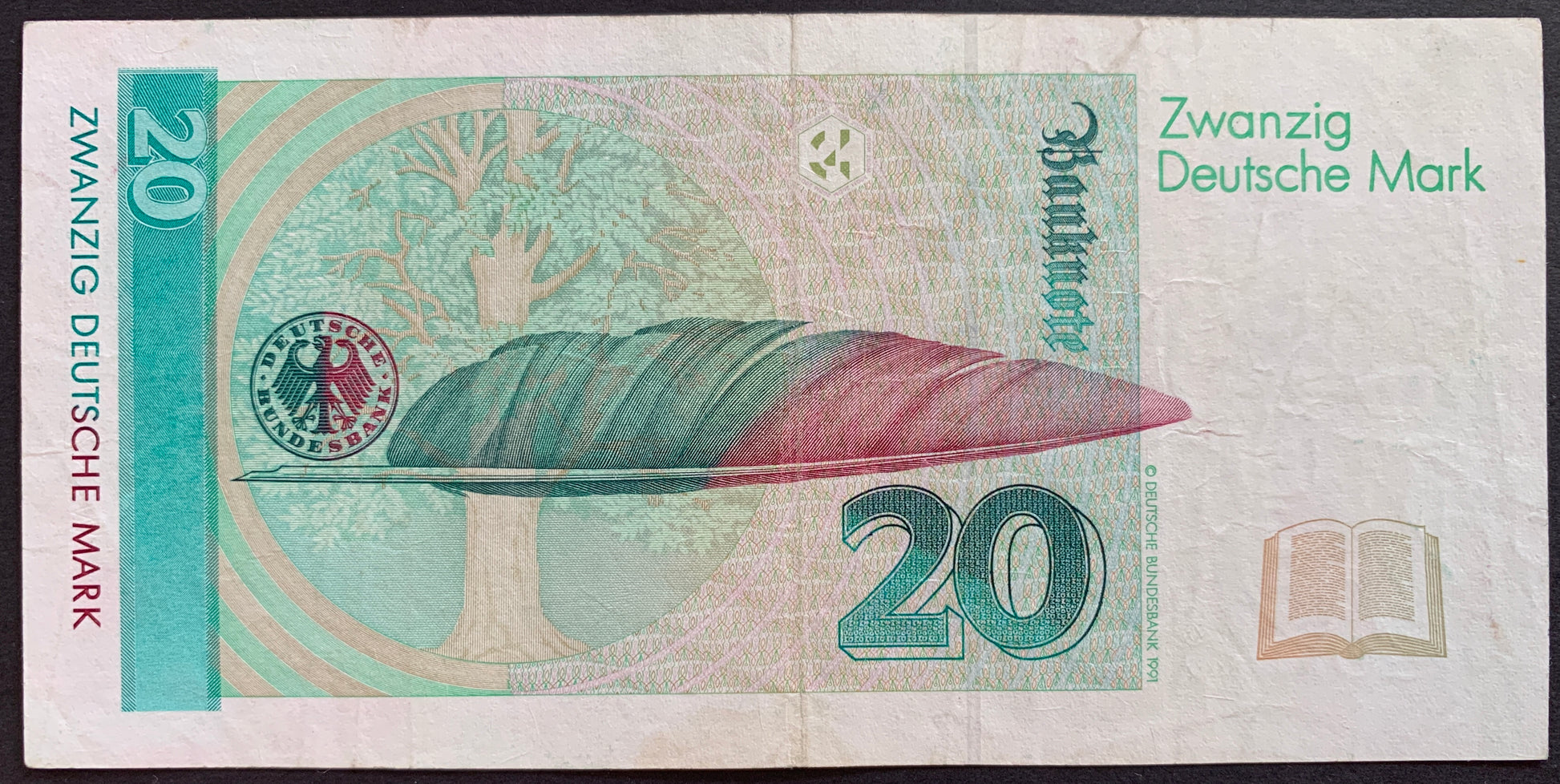 Beech tree (symbolizing Droste's novella "Die Judenbuche") and seal of Deutsche Bundesbank at left, quill pen and numeral 20 at centre, book at right