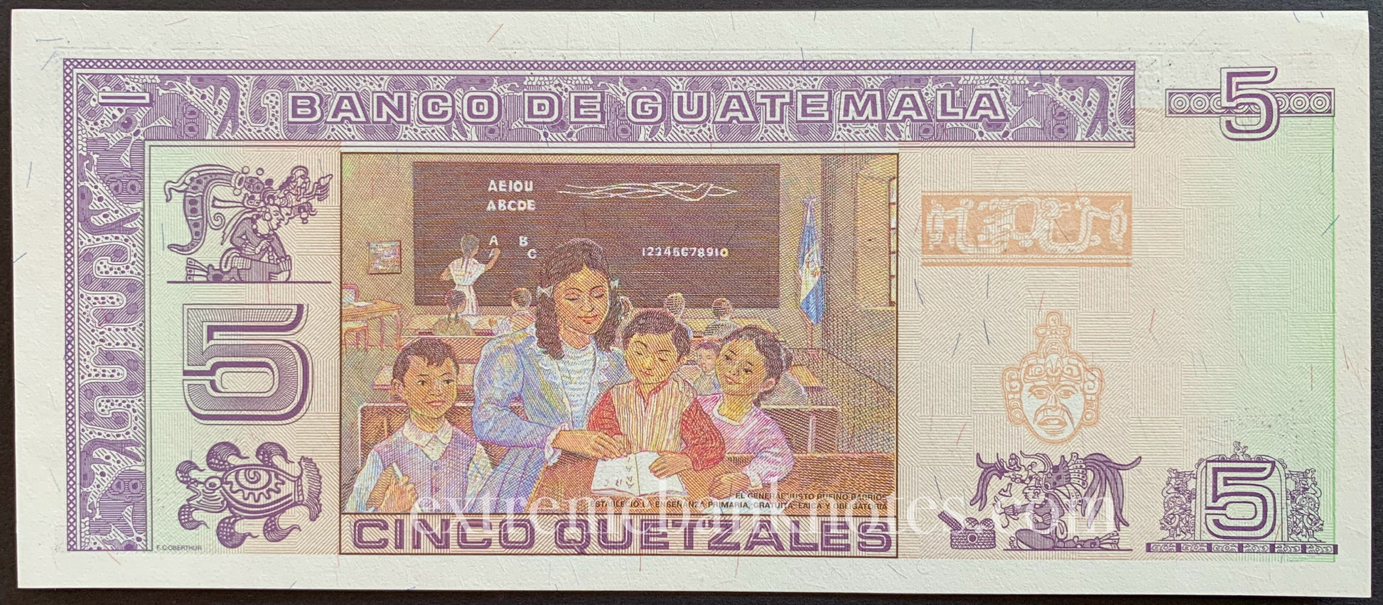 Guatemala five Quetzales from 2003 Pick no. 106a in Uncirculated condition. Graded according to the Standard Catalog of World Paper Money.