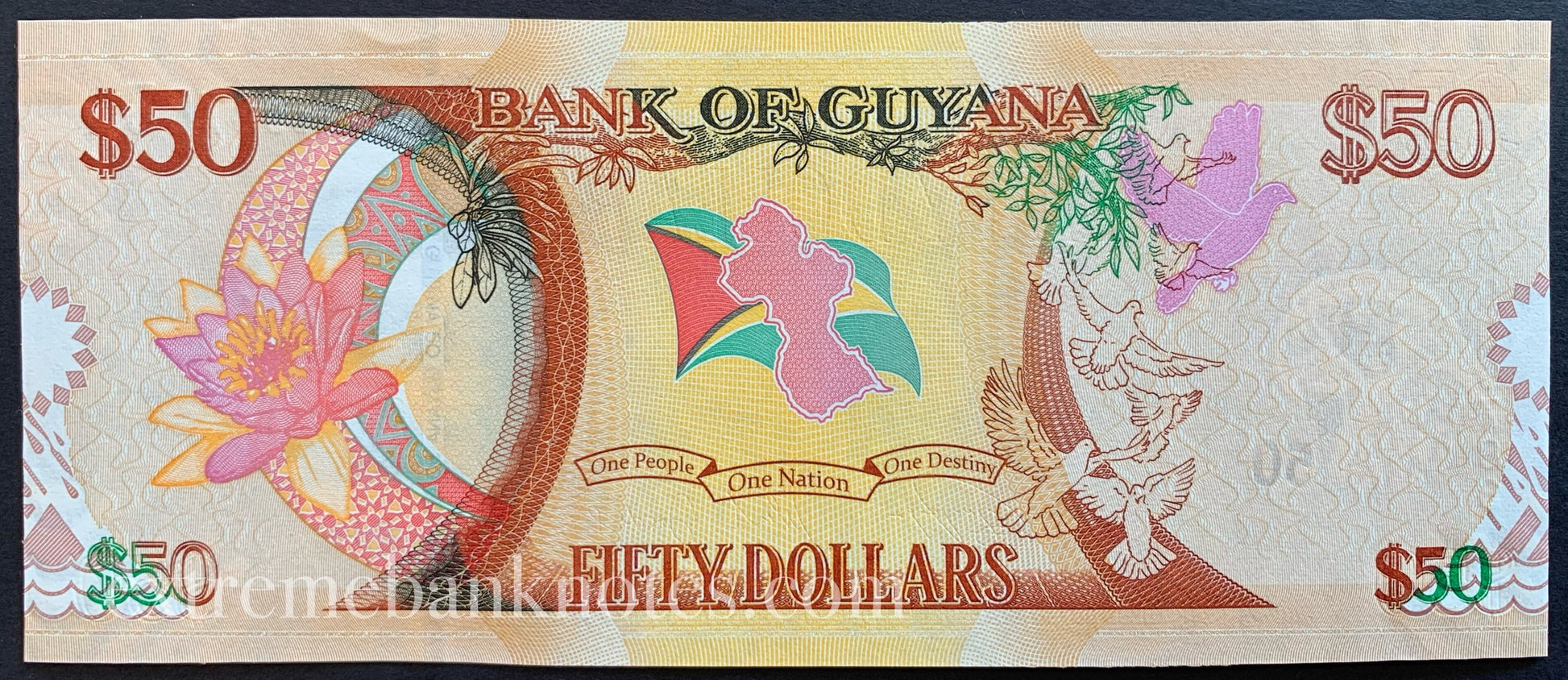 Guyana fifty Dollar commemorative banknote from 2016 Pick no. 41 in Uncirculated condition. Graded according to the Standard Catalog of World Paper Money.