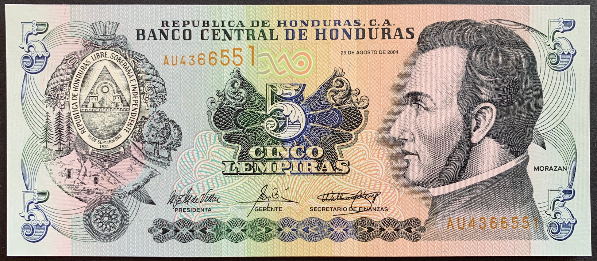 Honduras 5 Lempiras banknote from 2004 Pick no 85d in Uncirculated condition. Graded according to the Standard Catalog of World Paper Money.