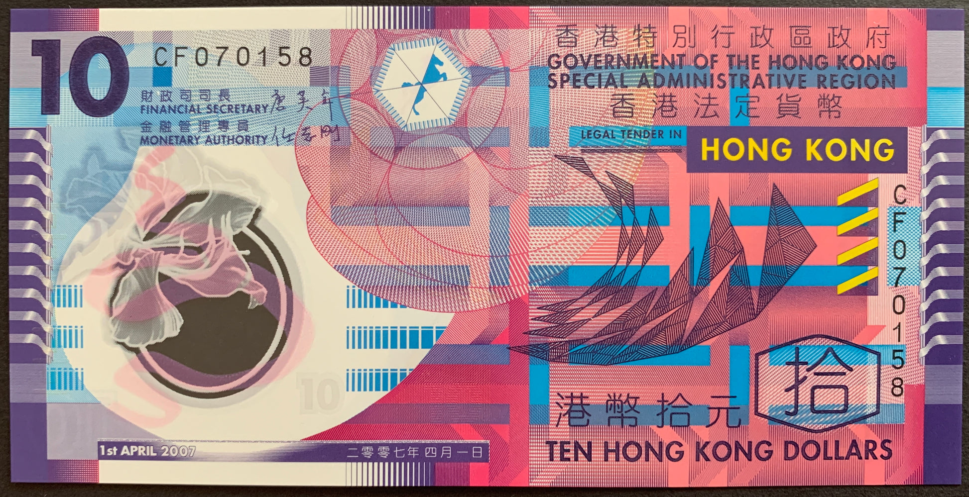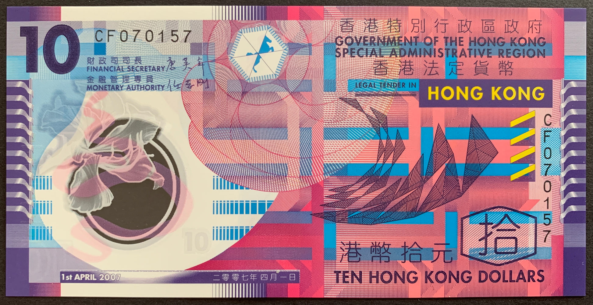 Hong Kong ten Dollar polymer banknote from 2007 Pick no. 401a in Uncirculated condition. Graded according to the Standard Catalog of World Paper Money.