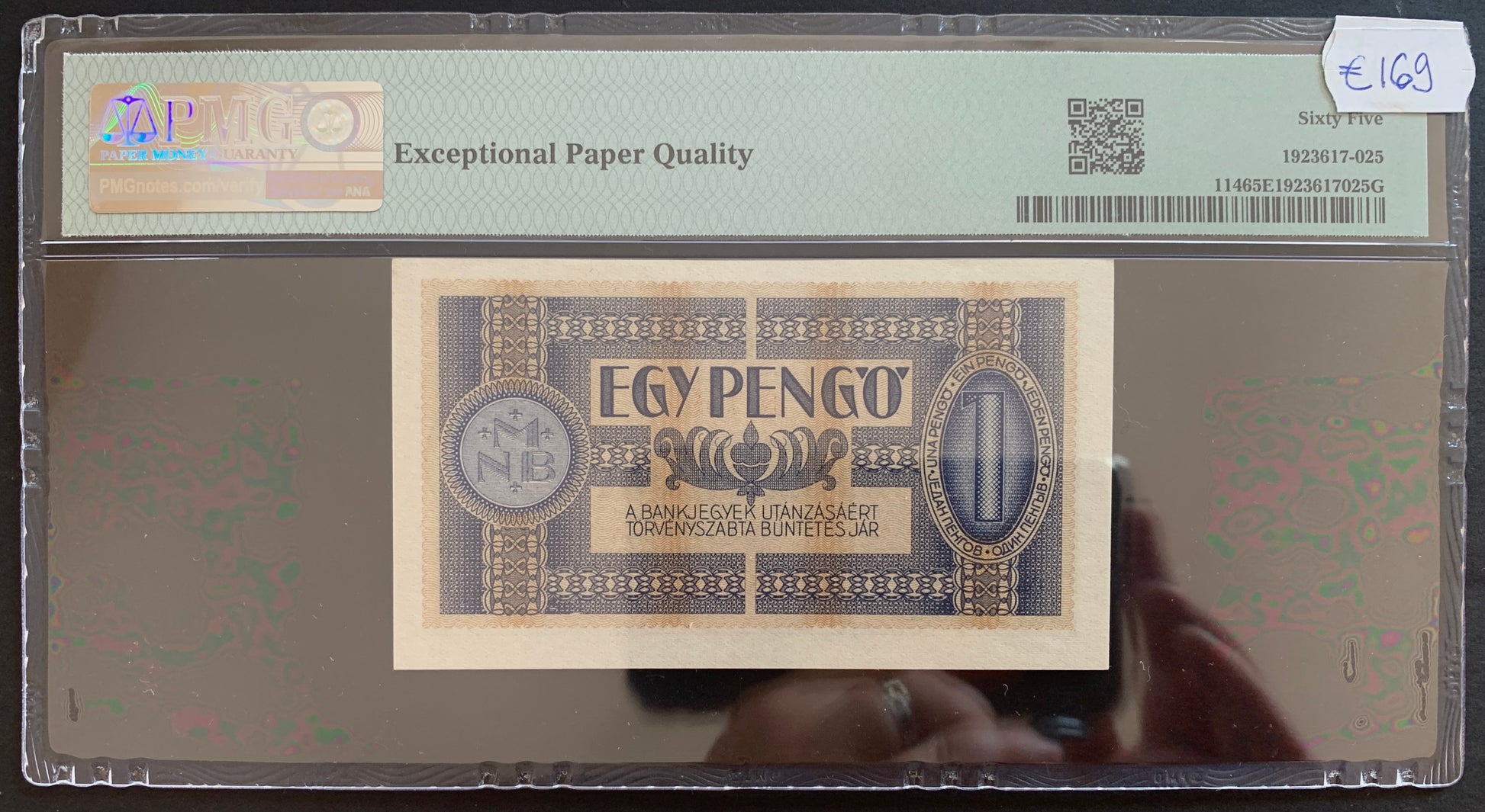 The banknote is authenticated and graded by PMG, recieving 65 out of 70 points, meaning it is in Uncirculated condition, as well as having an EPQ (Exceptional Paper Quality) grading.