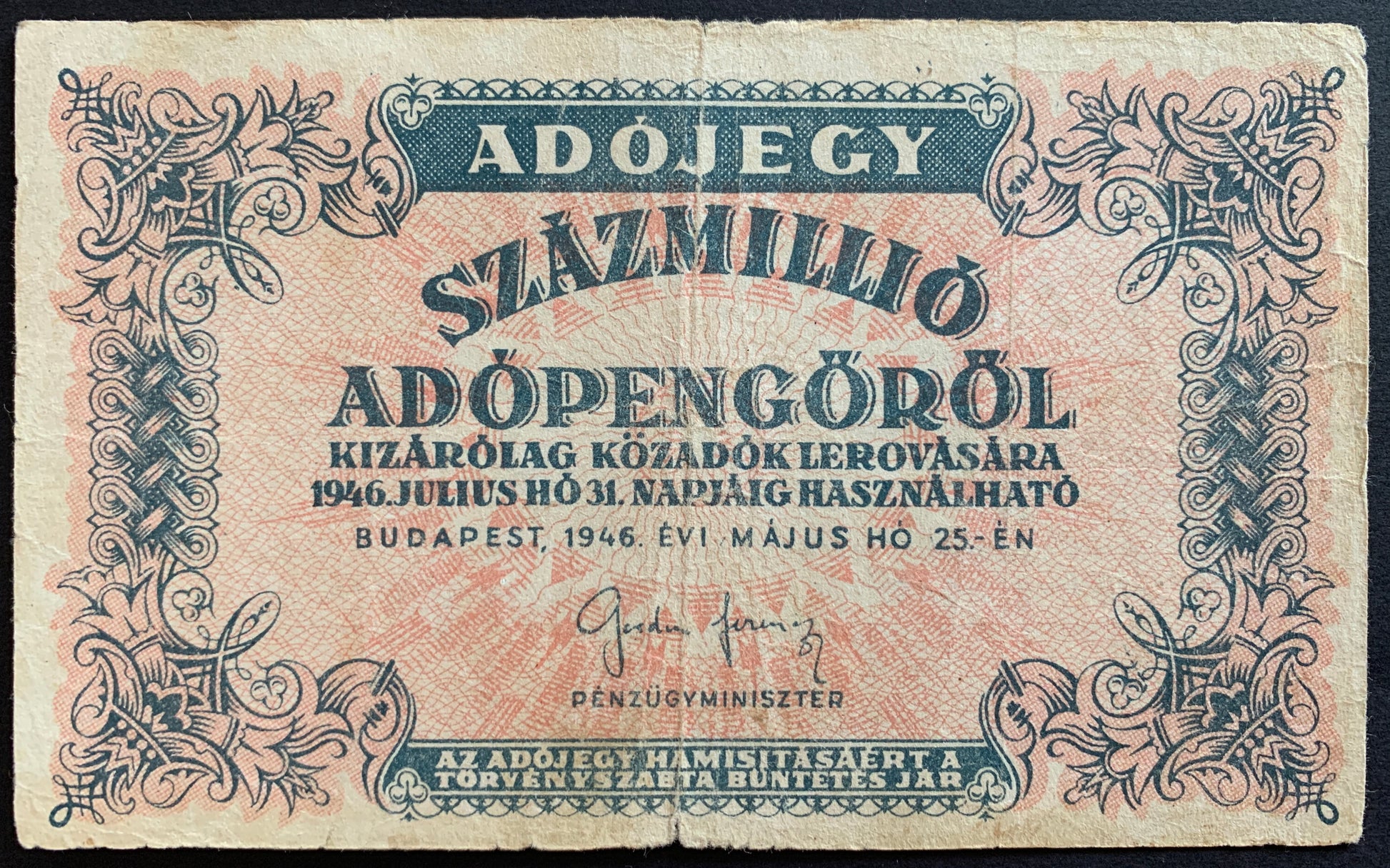Hungary one hundred million Adopengo banknote from 1946 Pick no. 142 in Fine condition. Graded according to the Standard Catalog of World Paper Money.