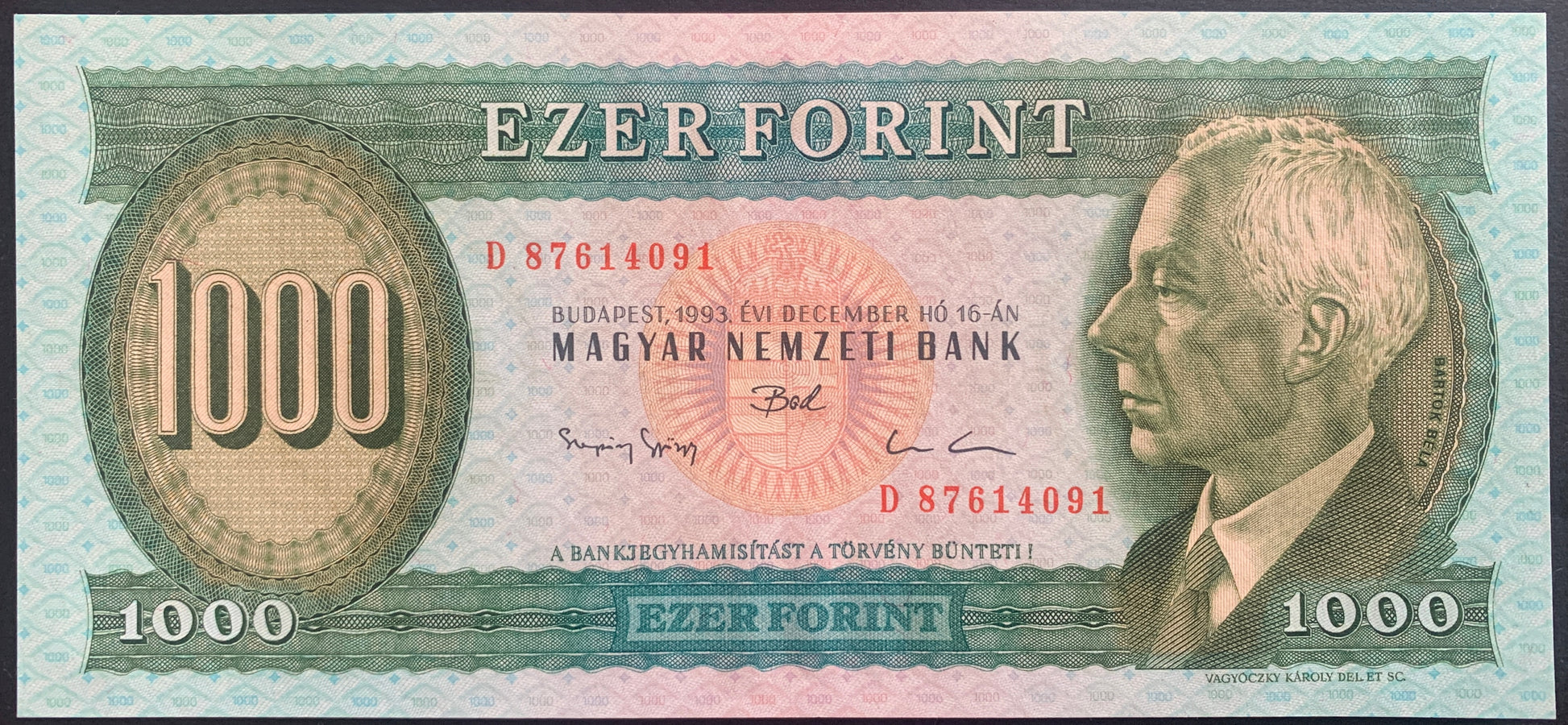 Hungary one thousand Forint banknote from 1993 Pick no. 176 in Uncirculated condition. Graded according to the Standard Catalog of World Paper Money.