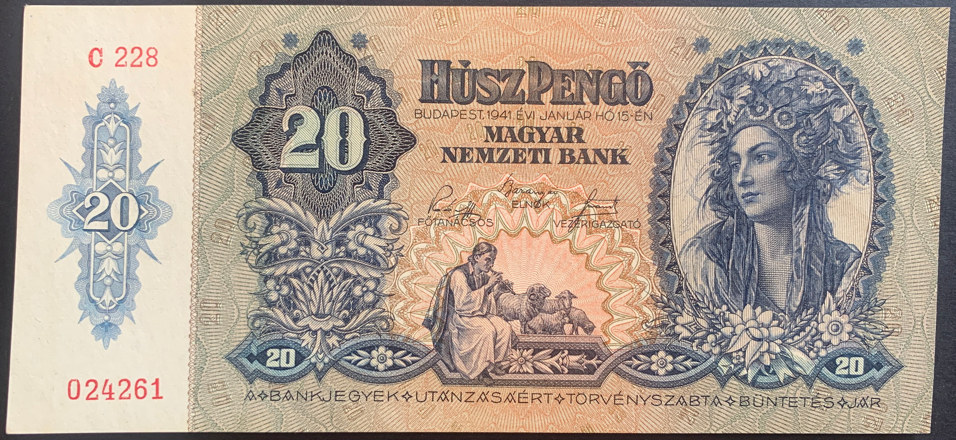 Hungary twenty Pengo banknote from 1941 Pick no. 109 in Uncirculated condition. Graded according to the Standard Catalog of World Paper Money.
