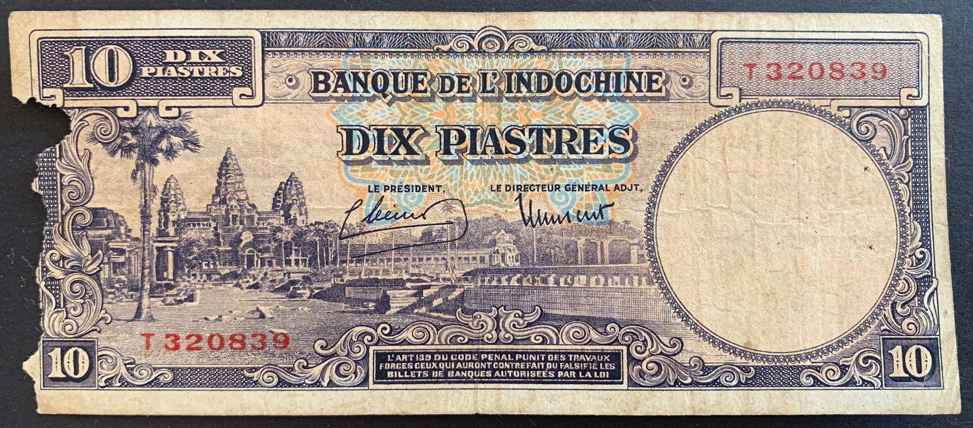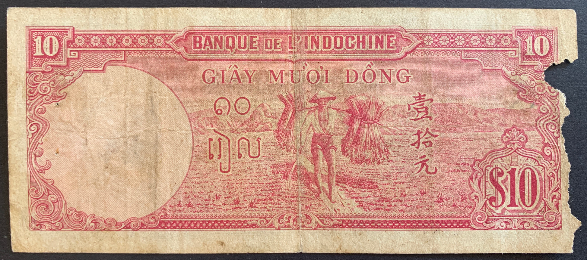 Indochina ten Piastre banknote Pick no 80 in Good condition. Graded according to the Standard Catalog of World Paper Money.