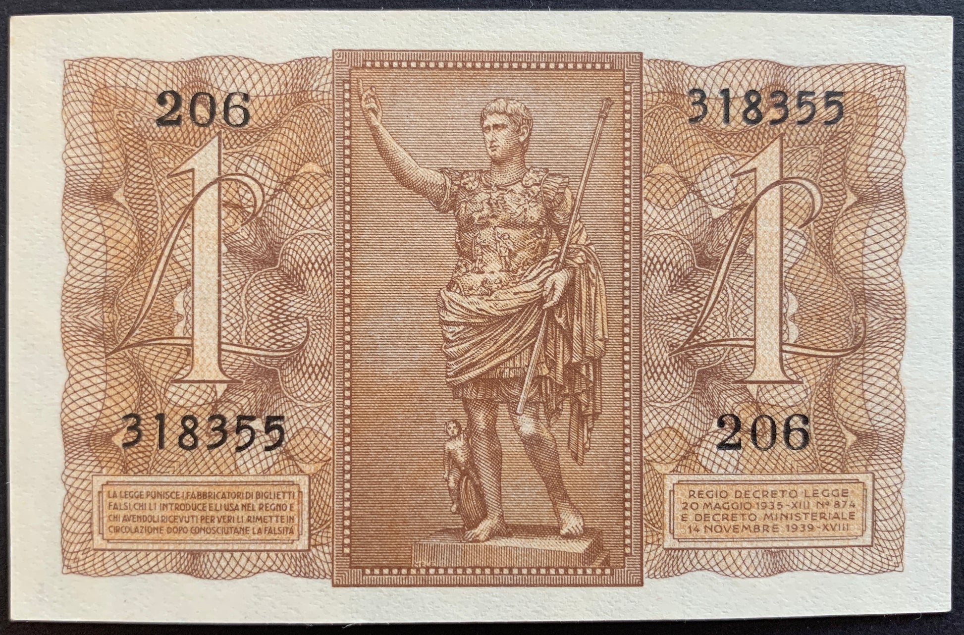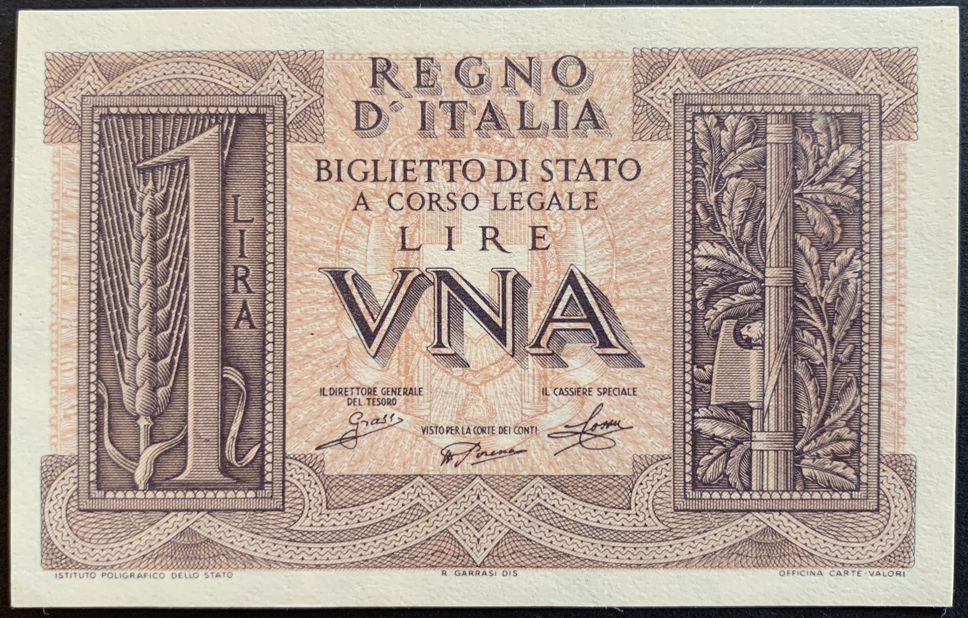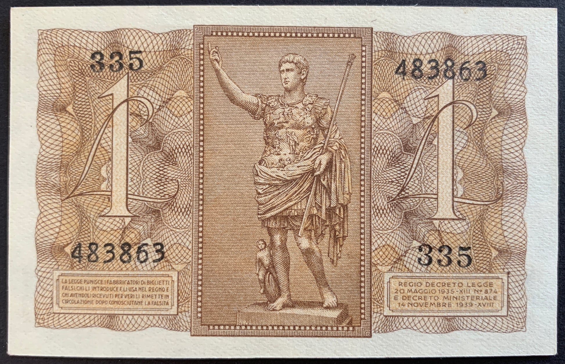 Italy one Lira banknote from 1939 Pick no. 26 in Uncirculated condition. Graded according to the Standard Catalog of World Paper Money.