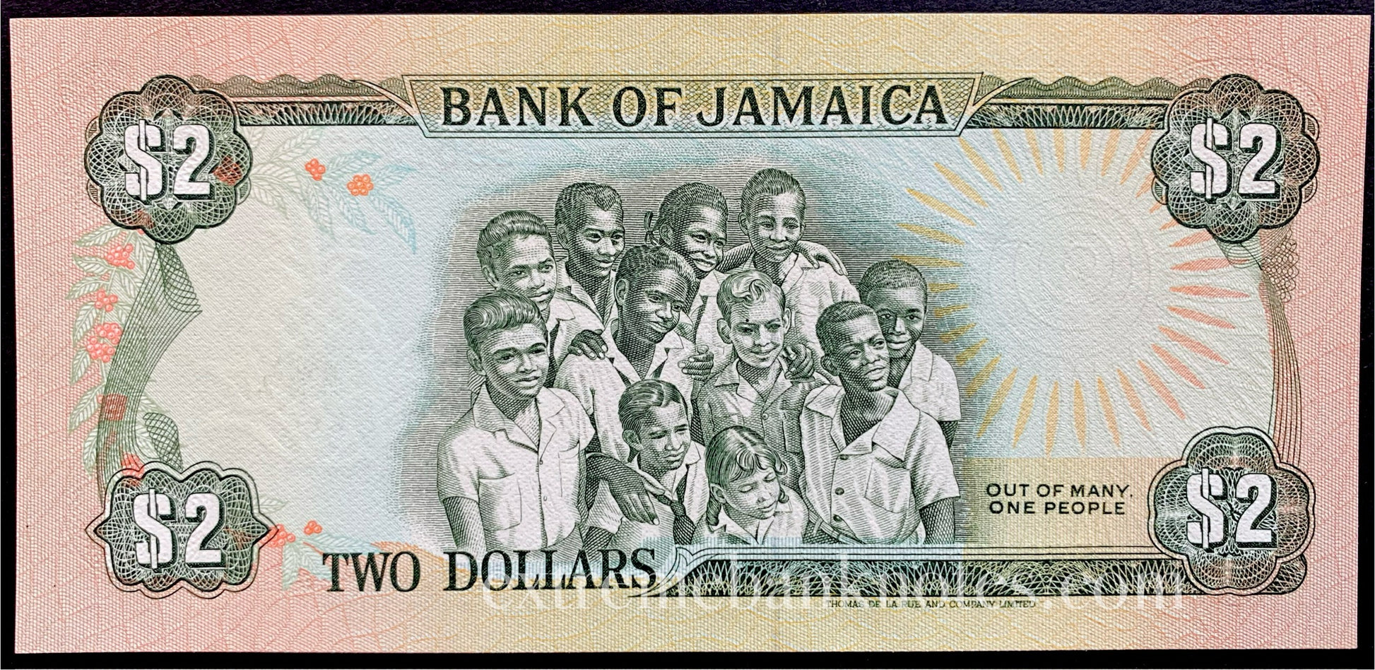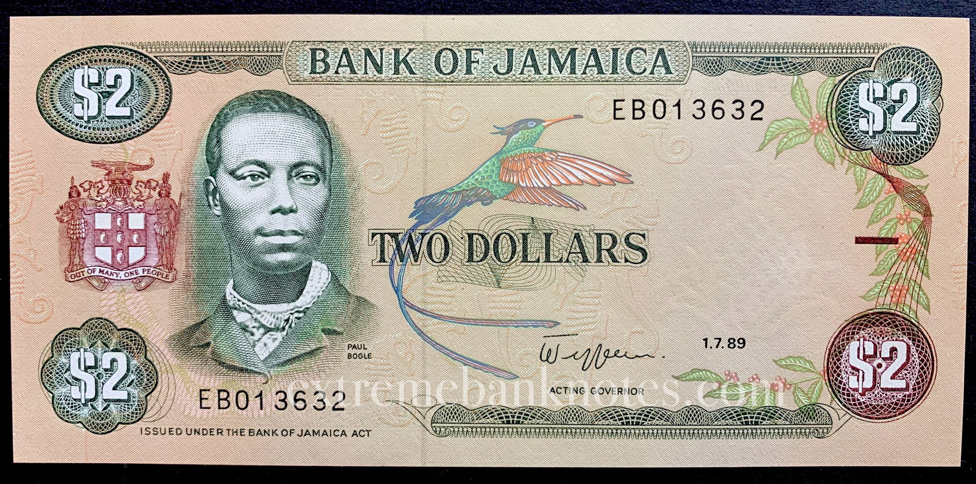 Jamaica two dollars from 1989 Pick no 69c in Uncirculated condition. Graded according to the Standard Catalog of World Paper Money.