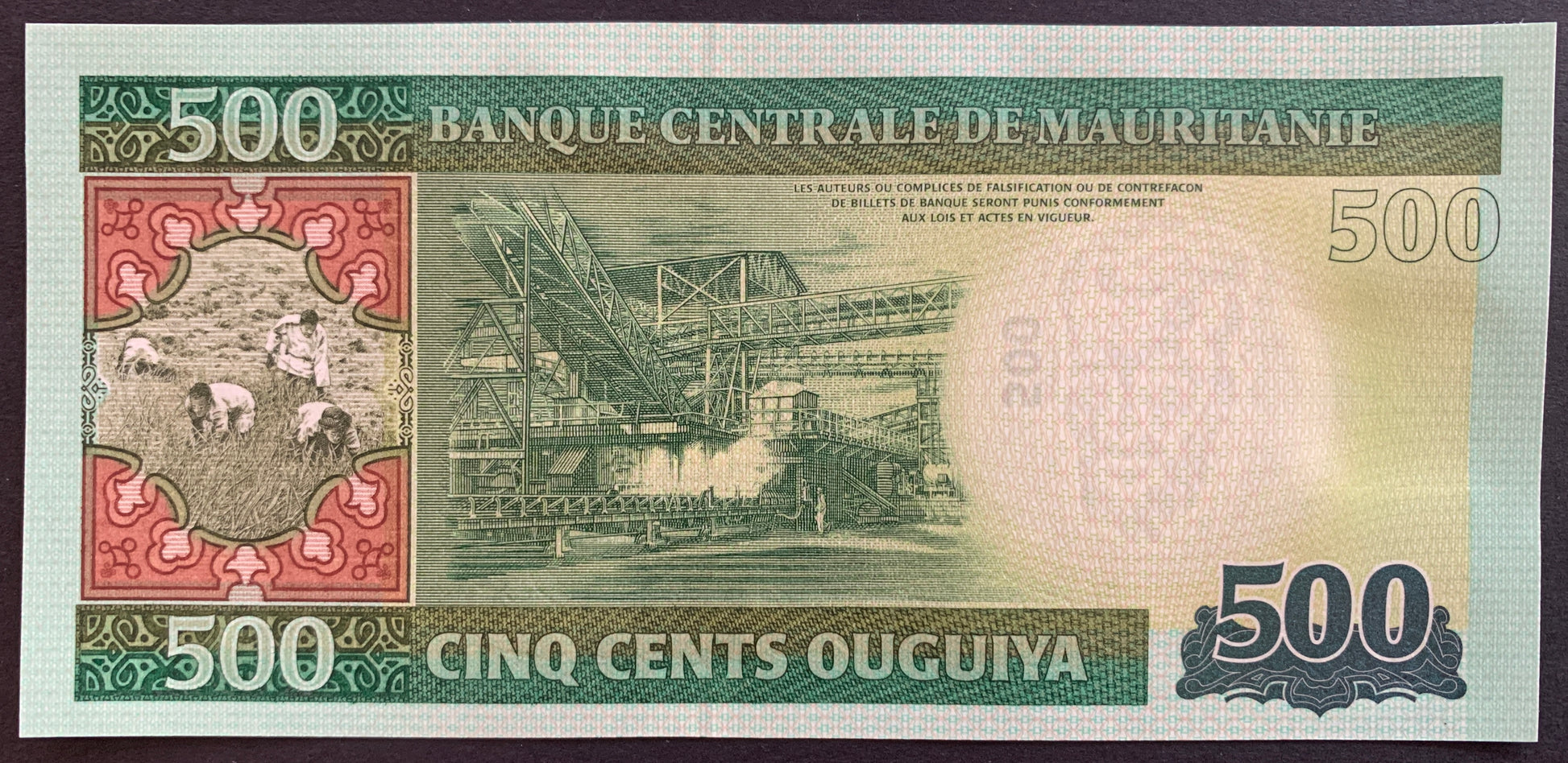 Mauritania five hundred Ouguiya consecutive banknotes from 2013 Pick no. 18 in Uncirculated condition. Graded according to the Standard Catalog of World Paper Money.