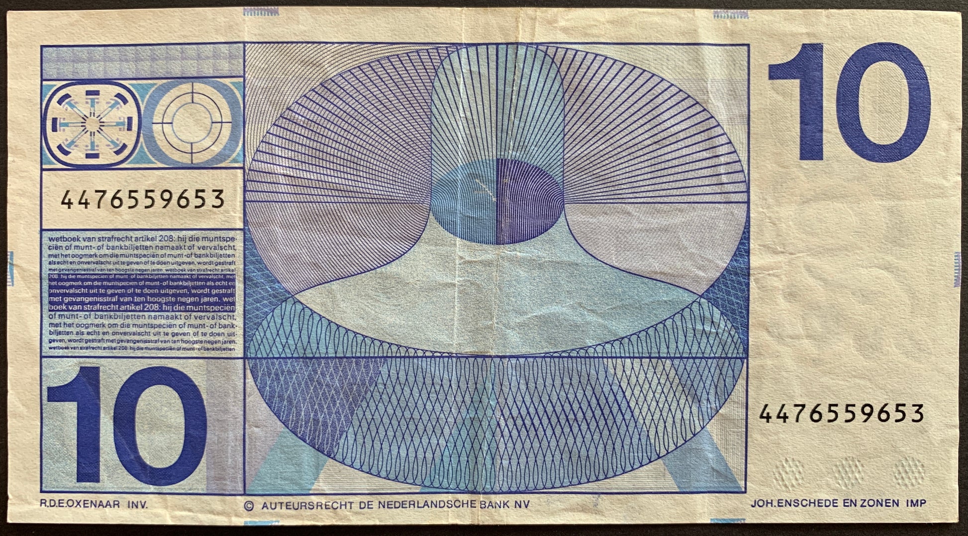 Netherlands ten Gulden banknote from 1968 Pick no. 91b in Fine condition. Graded according to the Standard Catalog of World Paper Money.