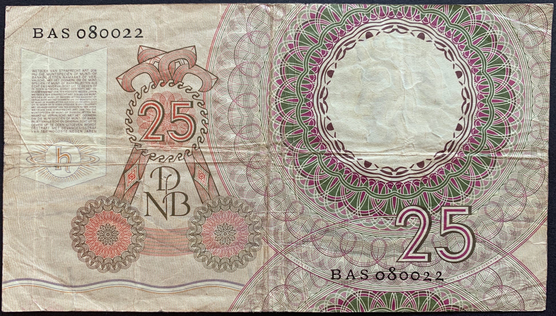 Netherlands twenty five Gulden banknote from 1955 Pick no. 87 in Very Fine condition. Graded according to the Standard Catalog of World Paper Money.
