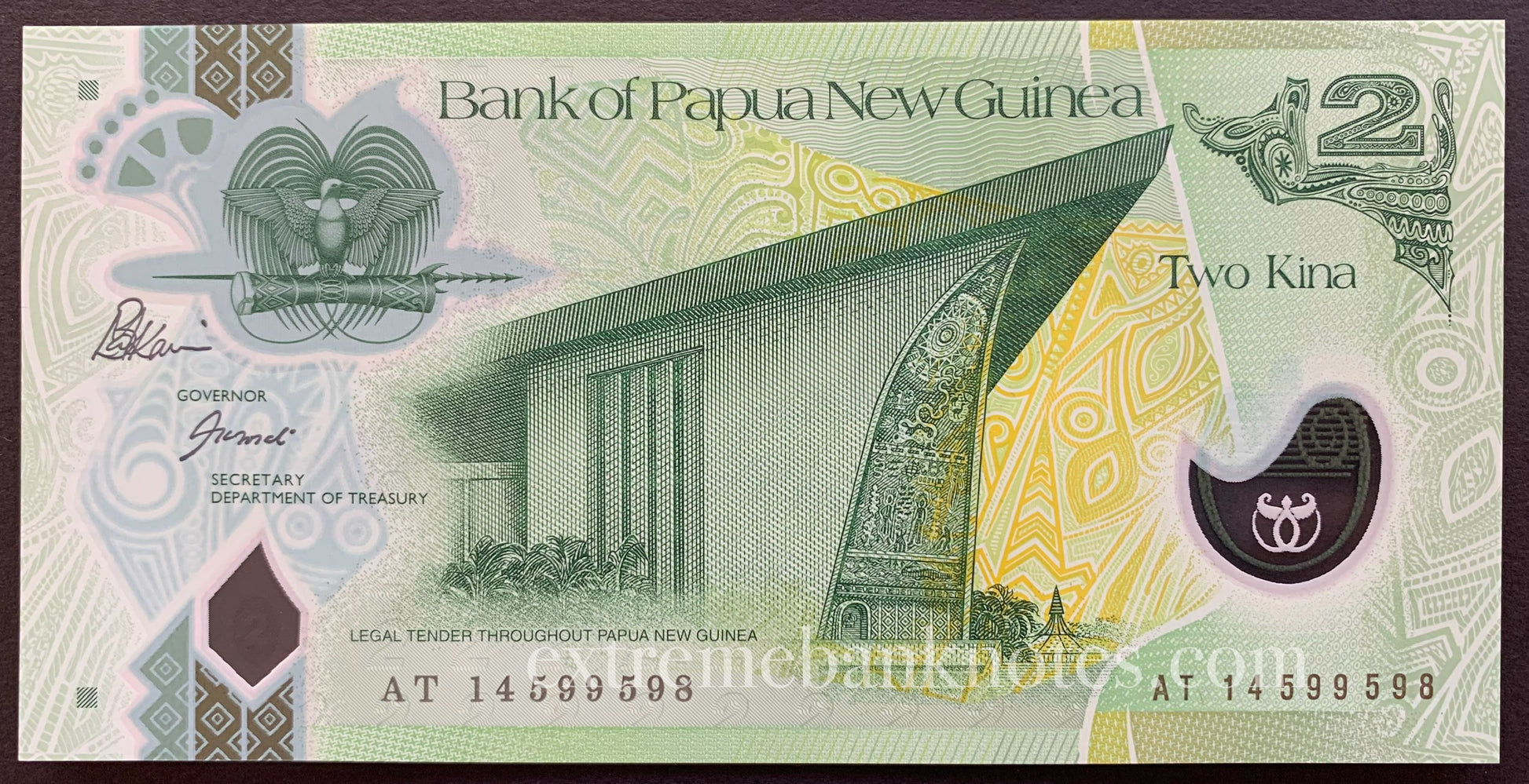 Papua New Guinea two Kina banknote from 2014 Pick no. 28d in Uncirculated condition. Graded according to the Standard Catalog of World Paper Money.