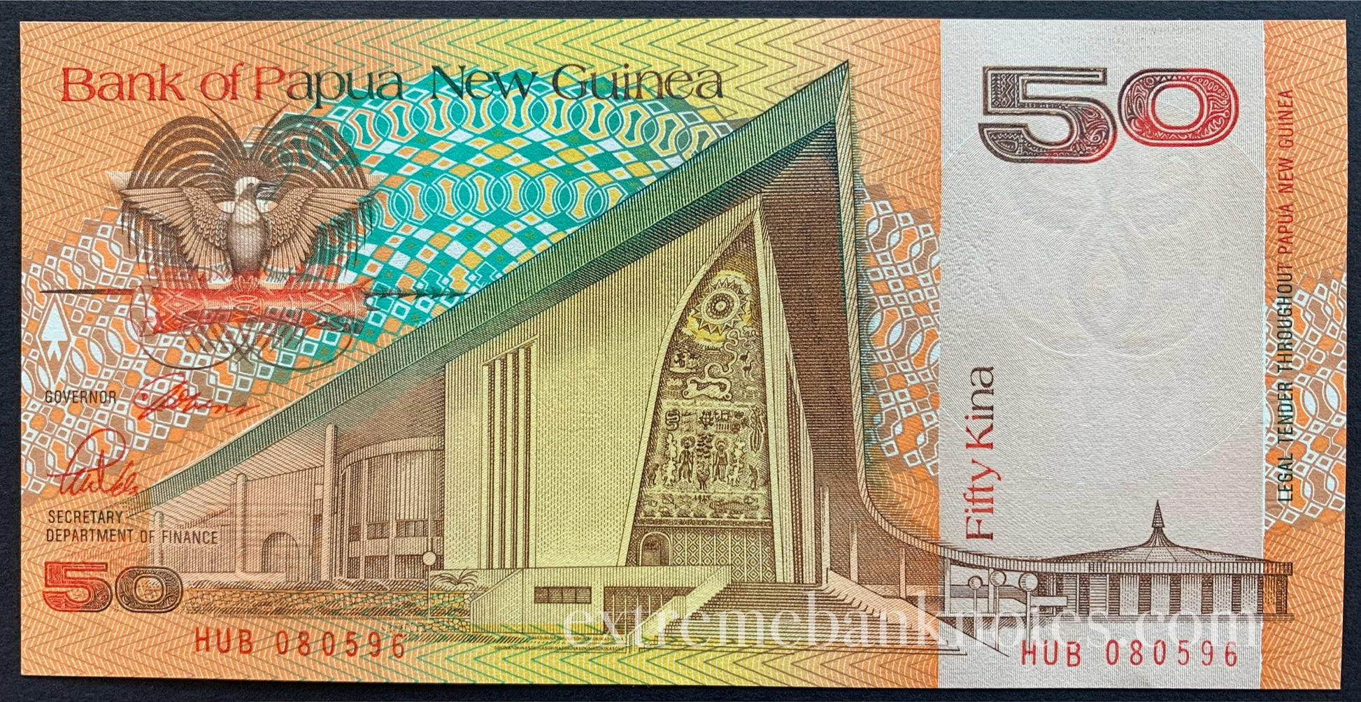 Papua New Guinea fifty Kina banknote from 1989 Pick no. 11 in Uncirculated condition. Graded according to the Standard Catalog of World Paper Money.