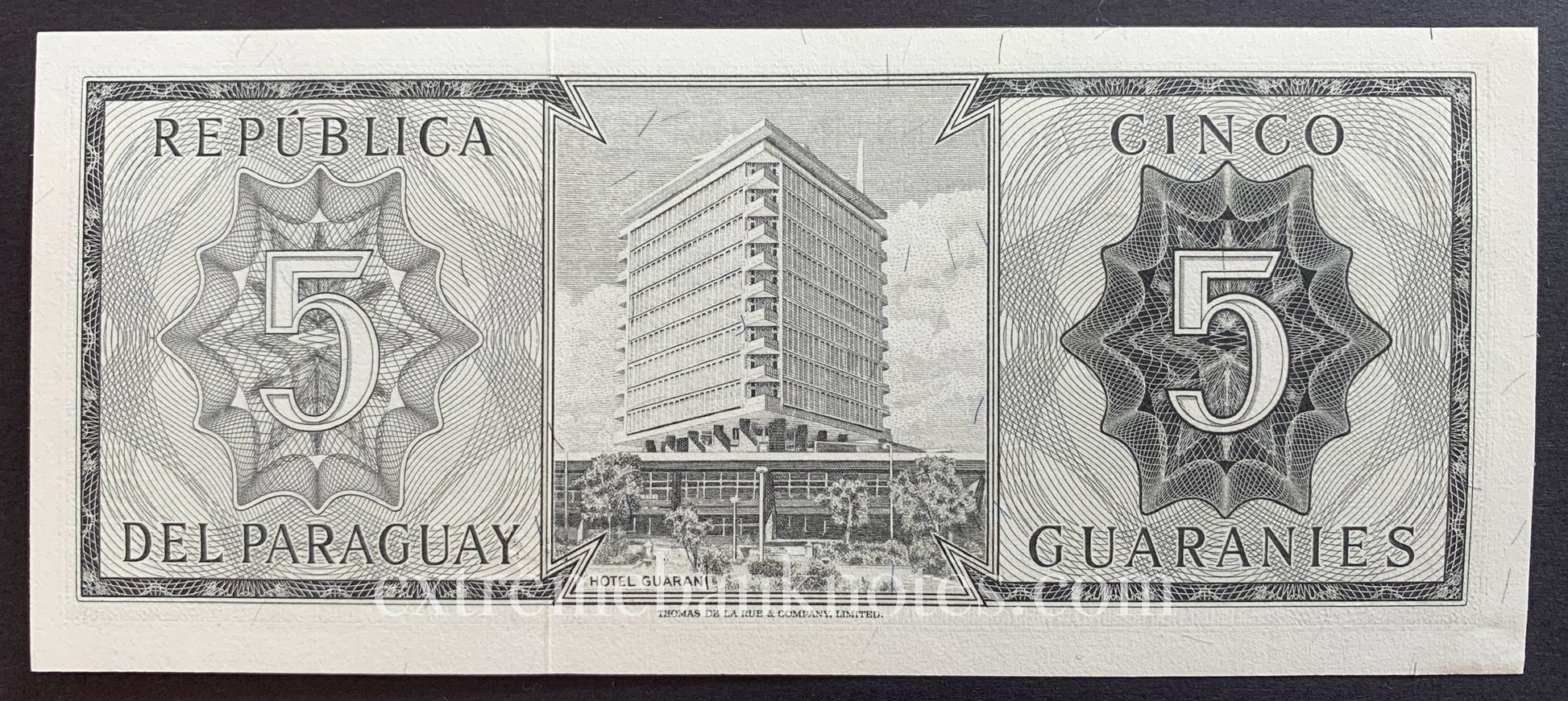 Paraguay five Guaraníes banknote from 1963 Pick no. 195b in Uncirculated condition. Graded according to the Standard Catalog of World Paper Money.
