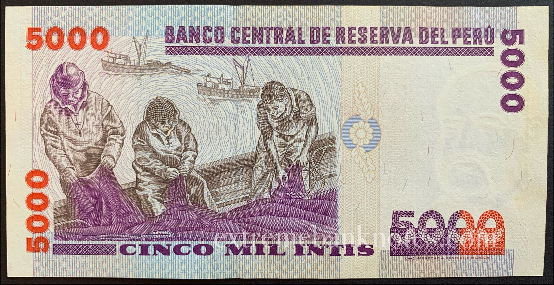 Peru five thousand Intis banknote from 1988 Pick no 137 in Uncirculated condition. Graded according to the Standard Catalog of World Paper Money.
