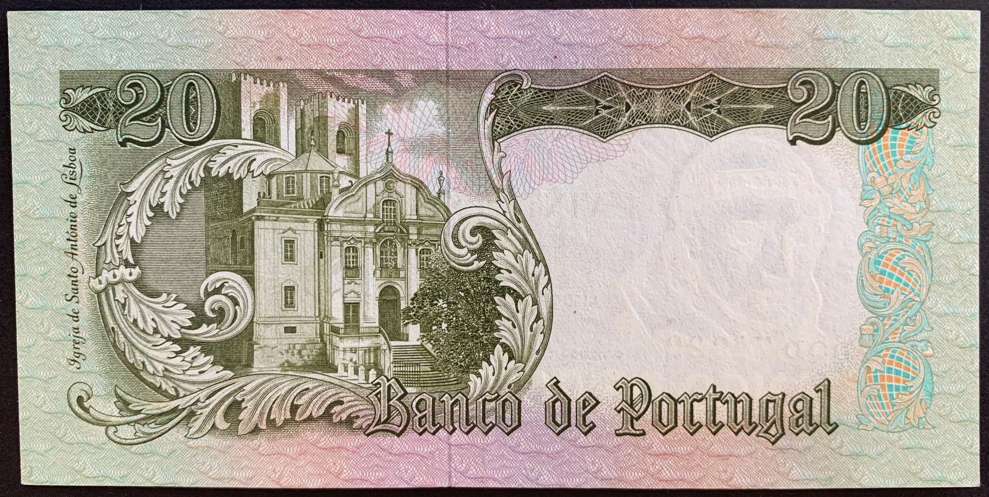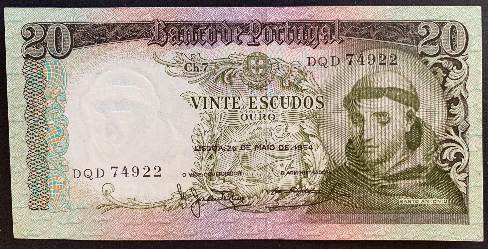 Portugal twenty Escudos banknote from 1964 Pick no. 167a in Uncirculated condition. Graded according to the Standard Catalog of World Paper Money.
