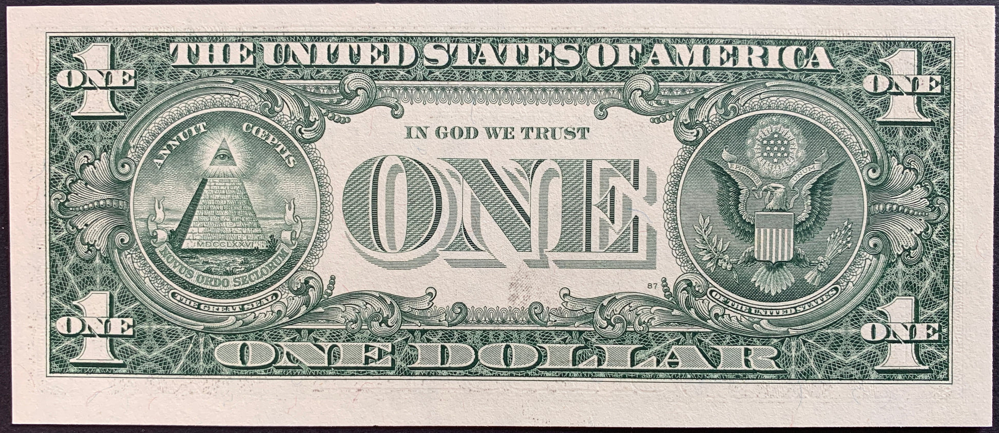 Portrait of George Washington at center, treasurer's signature and Federal Reserve Bank Seal at left, secretary's signature and Treasury Seal at right