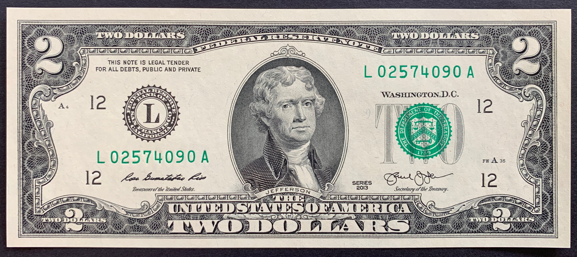 Portrait of Thomas Jefferson at center, treasurer's signature and Federal Reserve Bank Seal at left, secretary's signature and Treasury Seal at right