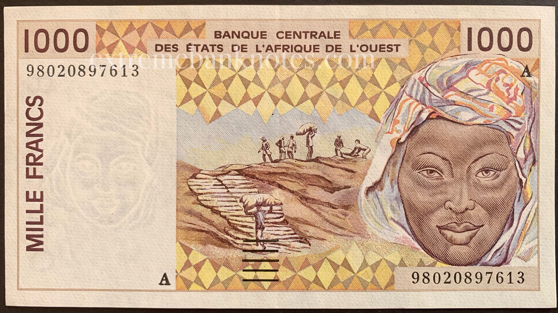 Western African States one thousand Francs banknote from 1998 Pick no 11A (Ivory Coast) in Extremely Fine condition. Graded according to the Standard Catalog of World Paper Money.