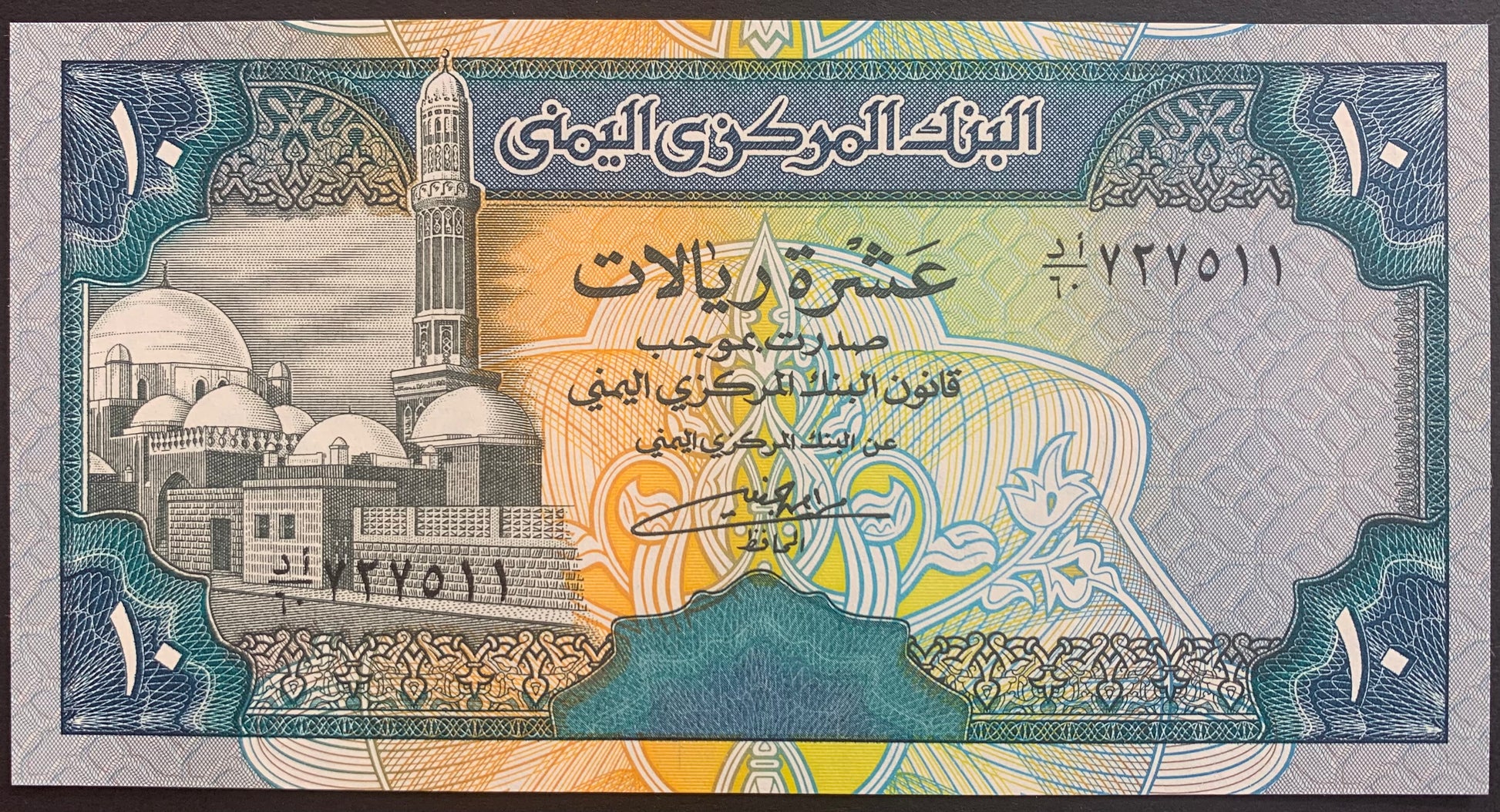 Yemen ten Rials banknote from 1992 Pick no 24 in Uncirculated condition. Graded according to the Standard Catalog of World Paper Money.