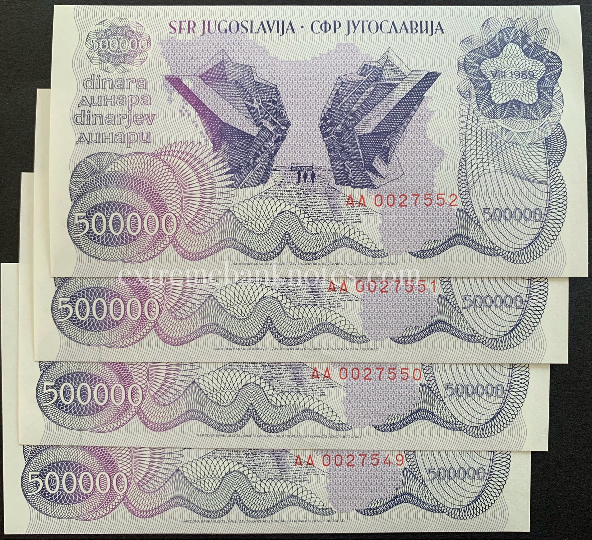 Yugoslavia 500 000 Dinara 1989 P-98 UNC consecutive serial numbers